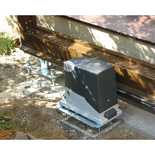Самоблокирующийся электромеханический привод серии ROAD итальянского производства. В комплект входят два пульта FLO2RE с плавающим кодом FloR и дальностью приема до 100 м. После остановки ворота заперты механически без дополнительного замка - шестерня привода удерживает рейку от ручного перемещения створки.